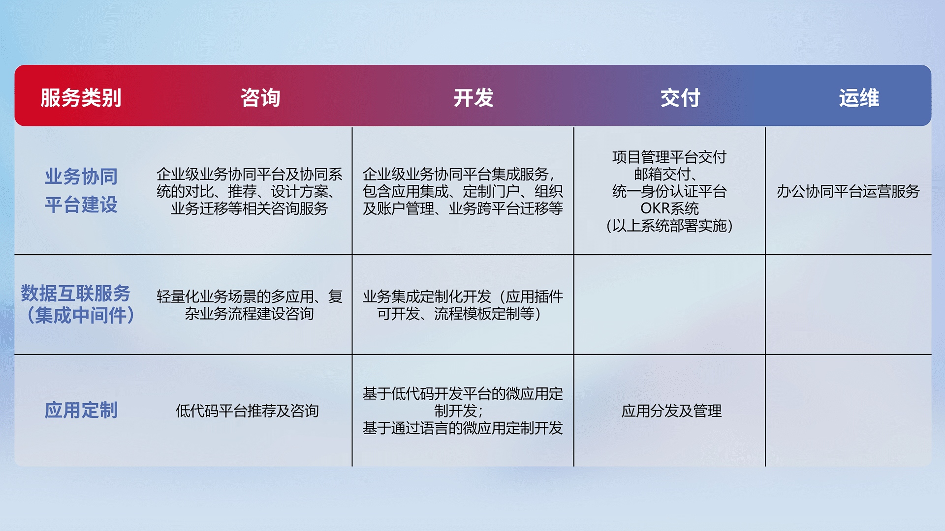 针对钉钉、、、企微、、IDaas等平台级产品提供产品的规划、、、、方案、、、交付、、、、定制化开发等服务,,,实现如统一协同办公、、智能客户服务、、、、混合会议管理、、智能数据查询、、、等业务场景,,,,实现数字化转型。。