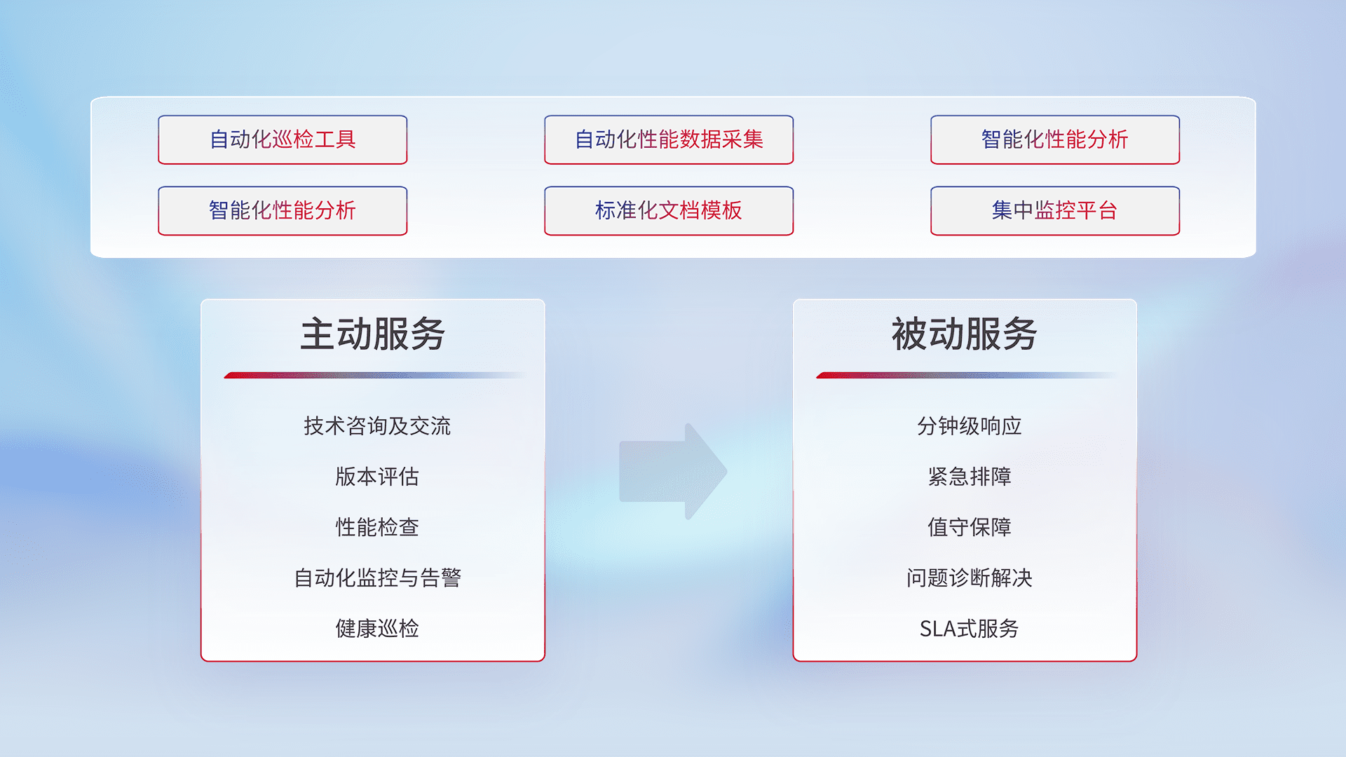 智能化工具和标准化文档,,,保障服务质量,,提供主动服务(包含技术咨询、、、、版本评估、、性能检查、、自动化监控与告警、、、健康巡检)和被动服务包含(分钟级响应、、、、紧急排障、、、值守保障、、、问题诊断解决、、、SLA服务)。。